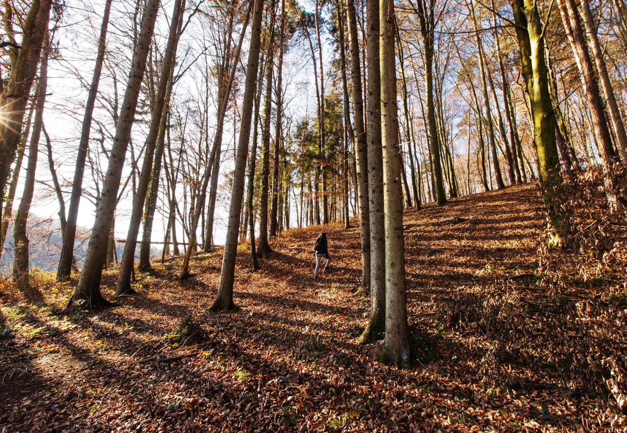 Durch Weinhänge, Obstgärten und Mischwälder führt uns der "Erlebensweg der Sinne" zur Aussichtswarte. Nebel hängen noch über den Hügeln, ein Sprung Rehe sprengt empört über unseren Weg, auf den Wiesen glitzert der Raureif in der Sonne. „Zu dieser Jahreszeit sind selbst die beliebtesten Wanderwege nicht überlaufen.“