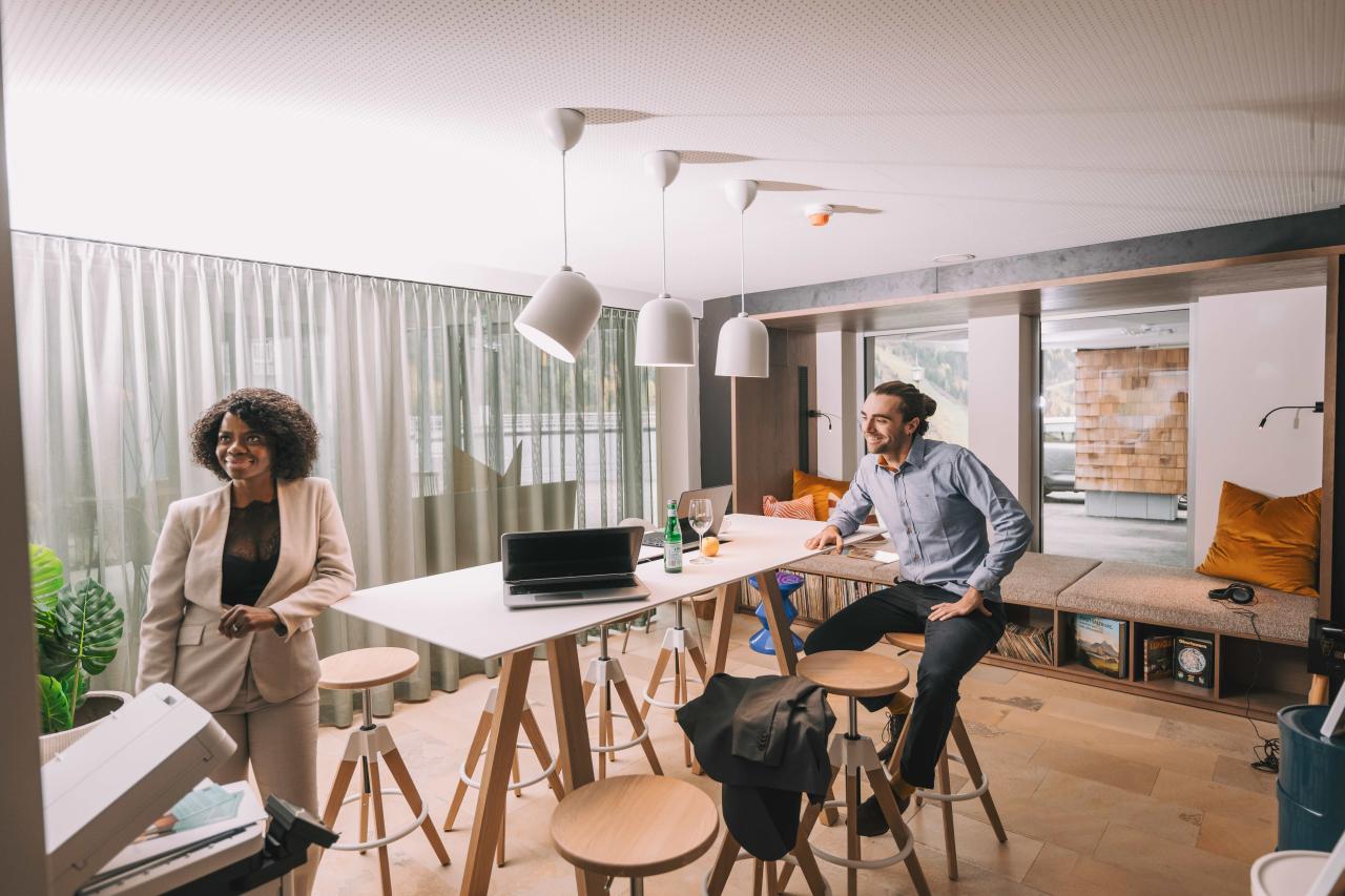 Apropos Arbeit: Auch das Thema Workation hat Sissi bewusst ins Konzept integriert. Viele Gäste seien selbstständig oder in verantwortungsvollen Jobs und müssten „das Geld ja auch irgendwo verdienen, das sie ausgeben“. Gleichzeitig brauche es dafür die richtigen Rahmenbedingungen: „Dass man einfach trotzdem im Urlaub ab und zu mal eine Stunde oder zwei seine E-Mails checken kann.“ Das kommt gut an. Deshalb wurde im Erdgeschoss eine eigene Workation-Zone geschaffen – ein Bereich, der nicht nur zum Arbeiten dient, sondern auch Begegnungen ermöglicht. Zusätzlich gibt es das Paket „Business Unusual“: Du kannst dein Zimmer vollständig als Büro einrichten lassen. „Der Gast hat die Möglichkeit, dass er sich eine komplette Ausstattung eines Büros in seine Suite oder in sein Zimmer liefern lassen kann – vom Bürostuhl bis zum Drucker.“
